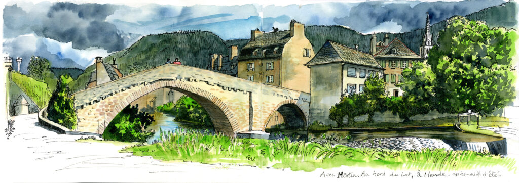 Tu n’aimais pas tellement les vallées, mais tu aimais les TER, ces pointillés entêtés sur la carte de France ; alors tu as accepté de m’accompagner le long du Cévenol, de me donner ton texte pour ce livre en hommage dessiné que furent les « rêveries d’une promeneuse ferroviaire », rêveries de villages perchés, rêveries de fond de vallées. On a bu des coups chez Patty à Saint-Georges-d’Aurac, cet ancien marais devenu lieu ferroviaire. Le lieu : des années auparavant, tu m’avais fait découvrir la signification de ce mot, su le faire résonner à l’endroit où il prend place. Pour bien marquer le coup, nous étions face au plateau Ardéchois, ta fine silhouette se dessinait devant ce grand paysage. J’étais là à l’invitation de Sophie et toi tu demandais : « qu’est-ce qu’un lieu ? », cette question à laquelle tu réponds si bien dans les « lignes secondaires » : « le lieu est à l’espace ce que l’instant est à la durée, un moment particulier, un événement. De l’espace, il en est sa densification, son épaississement ». Tu m’as donné ce repère, j’ai découvert que nous avions les mêmes, « modestes buttes d’herbes et de pierres couronnées par quelques frênes », « vies infimes et dérisoires, mais glorieuses car uniques ». Tu as tenu ensuite à me faire découvrir la belle ligne de Translozérien qui relie Mende à la Bastide, la plus haute de France en service régulier. Régulier, faut le dire vite, car une partie de notre voyage s’est fait dans ma voiture, faute de trains en service à ce moment-là. Heureusement, j’ai refait le voyage et tes paroles m’ont accompagnée, en « passant de l’ombre à la lumière » au débouché du grand plateau enneigé. Nous étions ensemble à Mende, quand j’ai dessiné ce paysage, le dos quasiment appuyé au grand mur qui soulève la voie ferrée un peu au dessus de la ville.