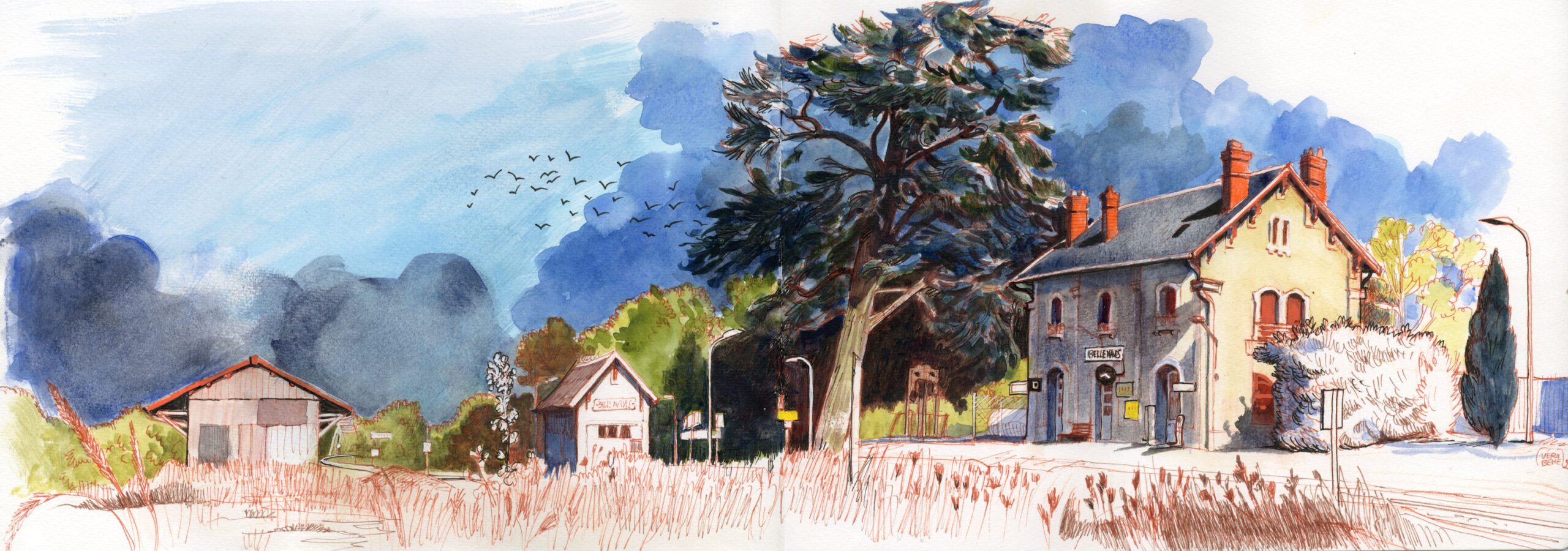 Avec son bâtiment voyageur, son abri de quai, son aiguillage et son entrepôt derrière lequel subsiste encore la grue rouillée, elle a tout ce qu’il lui faut, la petite gare de Bellenaves, pour être ce motif répété le long des voies de l’ancienne compagnie PO. Et bien sur, elle a son cèdre, arbre d’ornement et de prestige quand, à la fin du XIXe siècle, elle fut bâtie. Ce grand cèdre vers lequel j’ai choisi de faire converger les regards, grâce à la vivacité des couleurs complémentaires, des contrastes forts de l’ombre et de la blancheur du quai. Le quai blanc, épure de l’attente, ce dispositif, cet embarcadère où, comme au-dessus d’un port, tournoient des oiseaux ; ceux, parmi les vivants qui évoquent le plus le voyage et le mouvement. Et la gare bloquée là, éternelle, immobile, qu’on pourrait croire oubliée et puis un train va passer la réveiller de son fracas et de sa hâte. Il y aura des coups de sifflet, des bruits de porte, une espèce d’effervescence. Puis tout sera de nouveau rendu au silence, à la langueur, à la soie des attentes. Au plus loin du tourisme, la petite gare parle de poésie. D’une poésie qu’elle diffuse tout autour d’elle avec un soin délicat et qu’elle étend aux maisons environnantes, à la campagne un peu trop plate pour moi, à la grande forêt de hêtres qui n’en a pas besoin mais s’en saisit quand même.